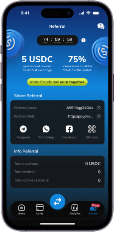Invita a amigos y gana el 50% de sus comisiones de intercambio durante 6 meses. Reglas claras y transparentes y pagos diarios: las recompensas van directamente a tu cuenta de PayPilot.